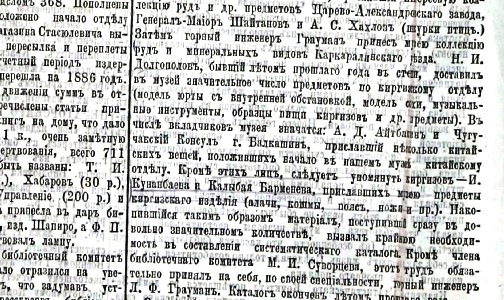 Сонымен бірге, басылымның 175-бетінде 1885 жылдың жазында музей мен кітапханаға американдық саяхатшылар Кеннан мен Фрост келгендігі туралы ақпарат берілген. Музейді аралап, қор байлығына таң-тамаша болған шетелдік меймандар этнография бөліміне үлкен қызығушылық білдіреді. Әсіресе, қобыз бен шамшыраққа көзі түскен суретші Фрост өзінің альбомына қажет деп заттарды суретке түсіріп алған.